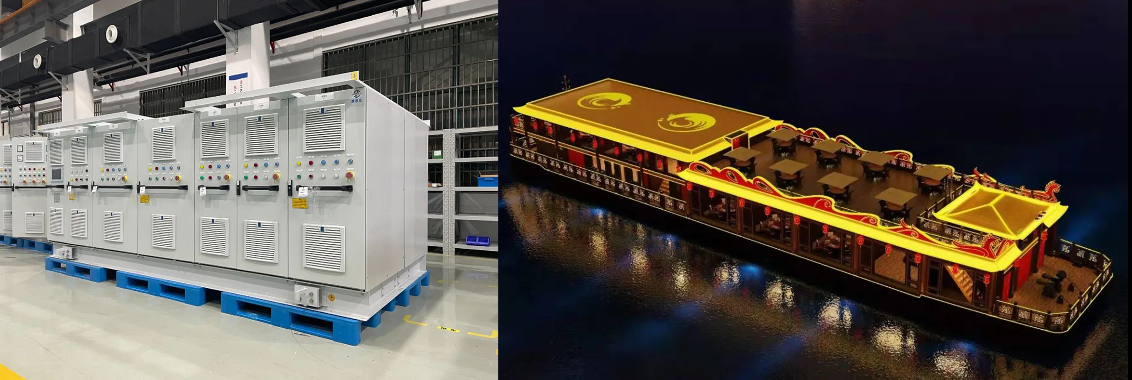 “大唐1號”游船由廣元市武則天文化旅游產(chǎn)業(yè)發(fā)展有限公司打造,由中國船舶集團有限公司第七一九研究所總體設(shè)計并集成供貨,賽思億國產(chǎn)變頻電控設(shè)備成為其關(guān)鍵設(shè)備供應商,為該系統(tǒng)提供共直流母線裝置。該船總長50.8m,型寬10.8m,型深2.8m,載客300人,整船鋰電池容量共計1397.76kWh,是目前西南地區(qū)電池容量最大、船舶尺度最大的純電動客船。該船動力系統(tǒng)經(jīng)過賽思億自主知識產(chǎn)權(quán)的直流母線變頻電控設(shè)備在直流母線進行并網(wǎng),驅(qū)動2臺225kW的全回轉(zhuǎn)舵槳,同時可為船舶日用負載提供高品質(zhì)的日用交流電源。