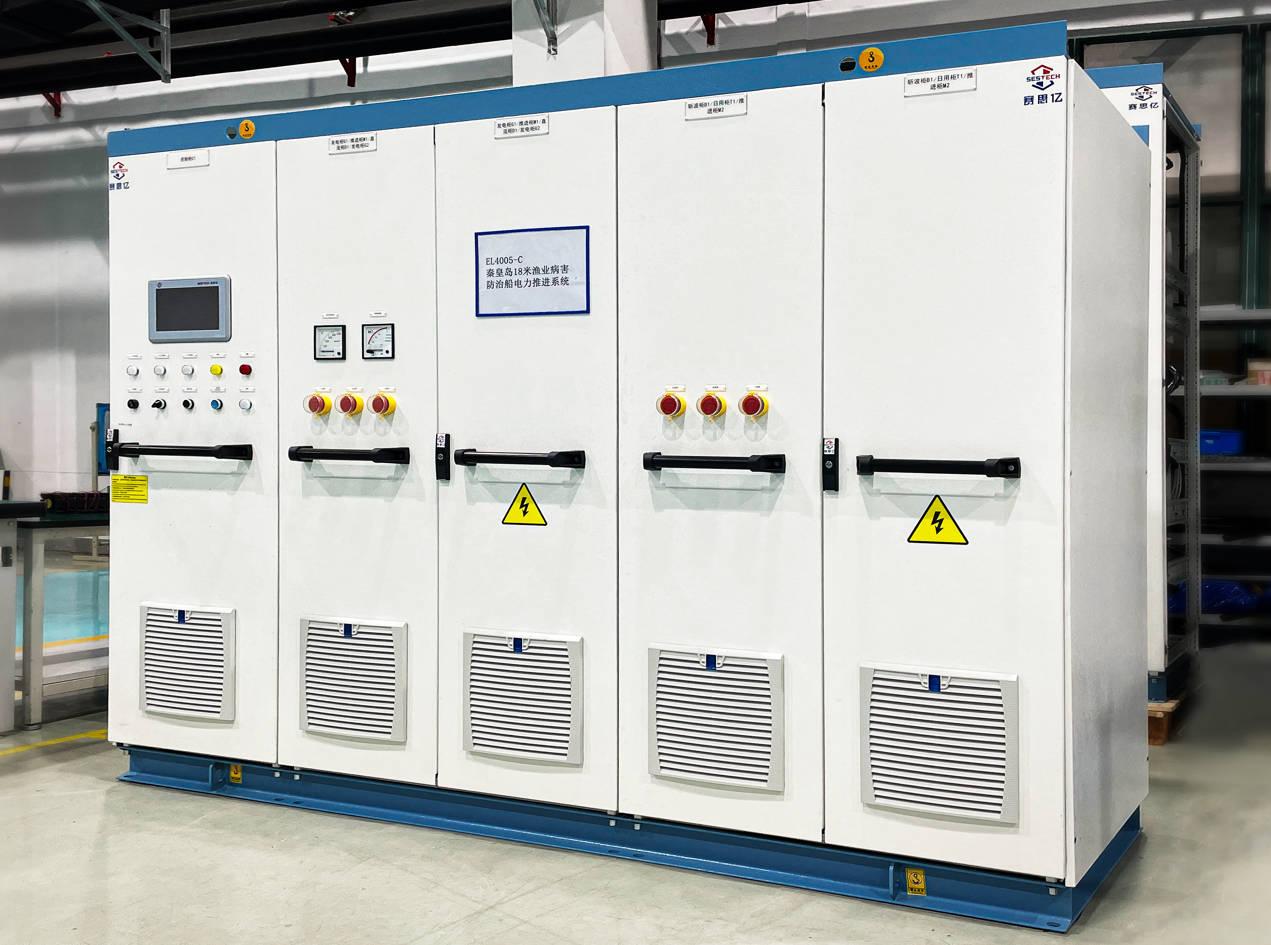 該6艘系列船舶由漁業(yè)機(jī)械儀器研究所設(shè)計、蘇州飛馳環(huán)??萍脊煞萦邢薰窘ㄔ?,總長19.60m,設(shè)計水線長18.50m,型寬4.60m,型深1.80m,設(shè)計吃水1.20m,系統(tǒng)配置2臺90kW的發(fā)電機(jī)組,1套322.56kWh鋰電池組,是新一代節(jié)能環(huán)保船型,主要用于秦皇島北戴河及附近海域赤潮治理工作。其中,變頻控制柜、鋰電池組、主推進(jìn)電機(jī)、推進(jìn)遙控系統(tǒng)、交流配電板、主變壓器等動力系統(tǒng)設(shè)備均由賽思億集成供貨,而動力系統(tǒng)關(guān)鍵裝備——變頻控制柜、推進(jìn)遙控系統(tǒng)均由賽思億負(fù)責(zé)設(shè)計生產(chǎn)和制造,擁有完全自主知識產(chǎn)權(quán)。