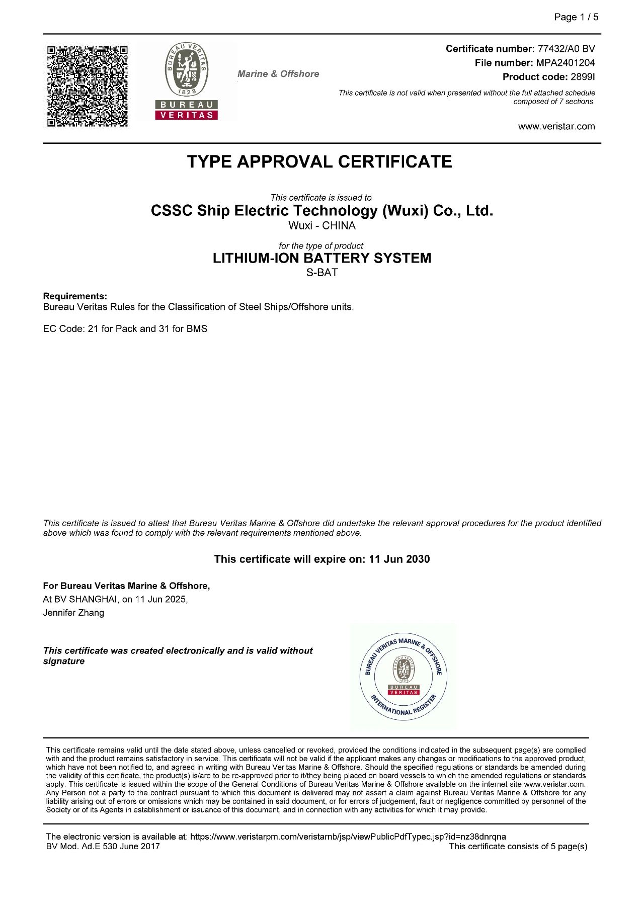 2025年6月11日,中船賽思億(無錫)電氣科技有限公司(CSSC Ship Electric Technology ( Wuxi) Co.,Ltd.)磷酸鐵鋰電池系統(tǒng)順利取得法國(guó)船級(jí)社 (BV) 型式認(rèn)可證書,是中船賽思億進(jìn)軍國(guó)際船舶建造項(xiàng)目的一塊強(qiáng)有力的“敲門磚”。截至目前,中船賽思億憑借強(qiáng)大的技術(shù)攻堅(jiān)能力,已實(shí)現(xiàn)自產(chǎn)電池包(模組兼容寧德時(shí)代、億緯鋰能等品牌)及BMS電池管理系統(tǒng)全系列產(chǎn)品的全覆蓋,且均已順利取得中國(guó)船級(jí)社(CCS)、法國(guó)船級(jí)社(BV)兩大主流船級(jí)社型式認(rèn)可證書,對(duì)中船賽思億深耕海內(nèi)外綠色船舶市場(chǎng)開拓具有重要意義。
