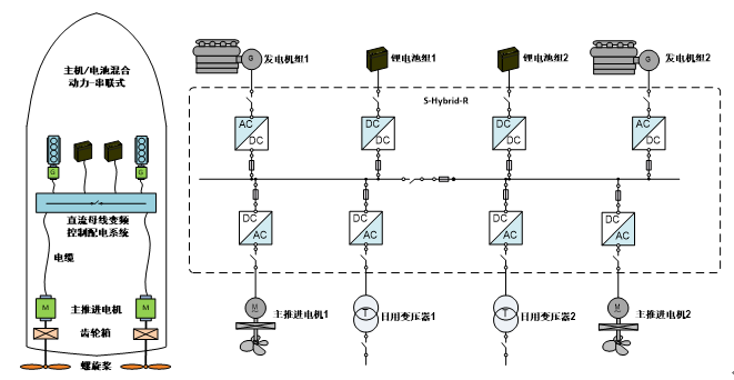 系統(tǒng)配置發(fā)電機組和超級電容作為游船動力,采用S-Hybrid-R串聯(lián)式解決方案,系統(tǒng)集成度高、接口簡便,明顯改善機艙設備占地空間及重量。