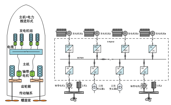 S-Hybrid解決方案:主機(jī)與推進(jìn)電機(jī)通過機(jī)械方式連接,根據(jù)不同的客戶及工況需求系統(tǒng)支持PTO(軸帶發(fā)電)/PTH(電力推進(jìn))/PTI(混合推進(jìn))三種不同運(yùn)行模式。