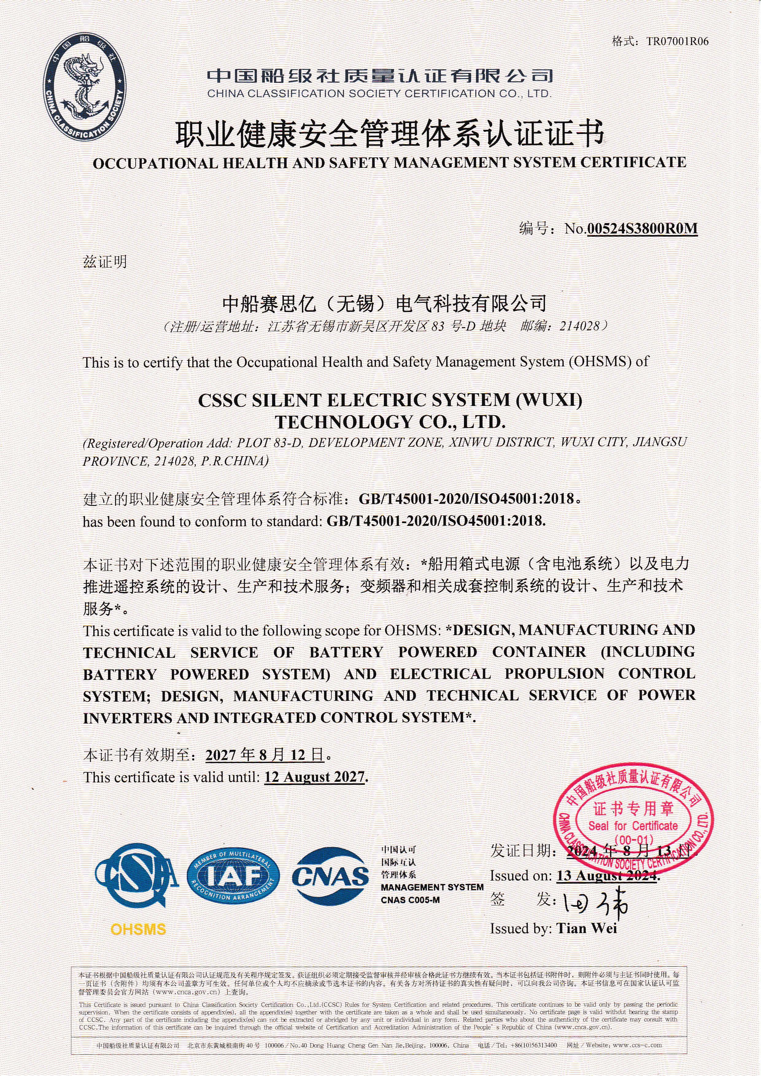 職業(yè)健康安全管理體系認(rèn)證證書