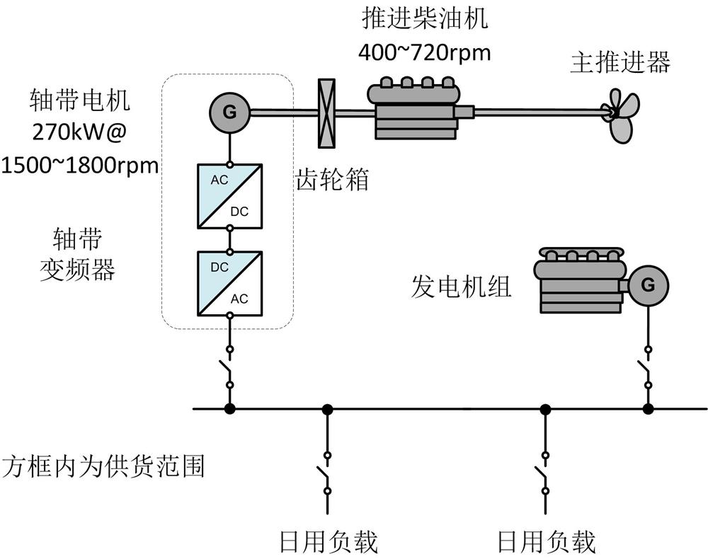 6000DWT瀝青船,采用賽思億S-Hybrid混合動力系統(tǒng),具有穩(wěn)定可靠、電源品質(zhì)高、性價比高等優(yōu)勢,相比于全電力推進(jìn)系統(tǒng),初始投資小,在不改變船舶原有主機動力形式的前提下,充分利用船舶在遠(yuǎn)洋航線的經(jīng)濟航速工況,系統(tǒng)通過主機冗余功率帶動異步電機發(fā)電運行,在提高主機負(fù)荷率改善其油耗的同時,可以關(guān)停船舶輔機,節(jié)省了船舶的運營油耗。