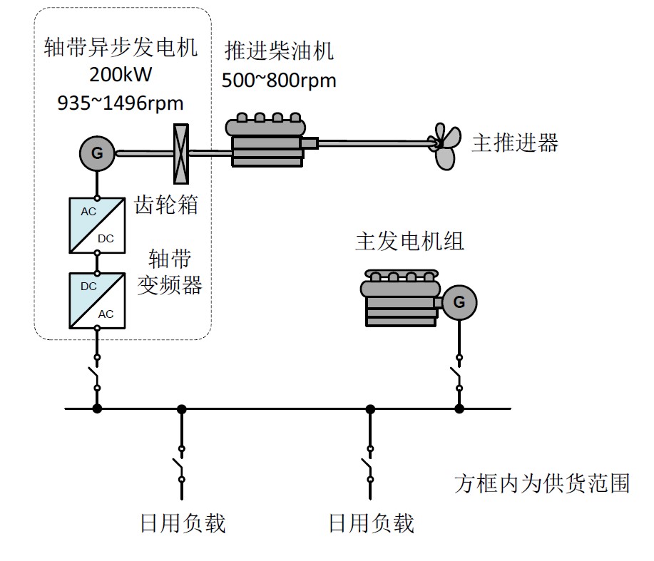 高欄01/02散貨船,采用S-Hybrid 主機(jī)+電力推進(jìn)混合動(dòng)力系統(tǒng),在不改變船舶原有主機(jī)動(dòng)力形式的前提下,充分利用船舶在遠(yuǎn)洋航線的經(jīng)濟(jì)航速工況,通過主機(jī)冗余功率帶動(dòng)異步電機(jī)發(fā)電運(yùn)行,在提高主機(jī)負(fù)荷率改善其油耗的同時(shí),可以關(guān)停船舶輔機(jī),節(jié)省了船舶的運(yùn)營(yíng)油耗。